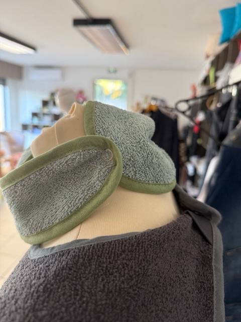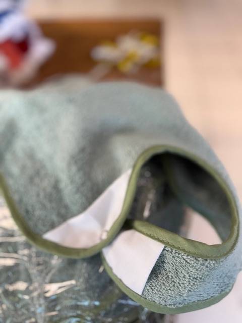 En complément, 25 bavoirs en éponge bio de 340g/m², au format pratique de 50x30 cm, ont été confectionnés en vert tilleul, dotés de pressions sur le côté pour une utilisation facile.
